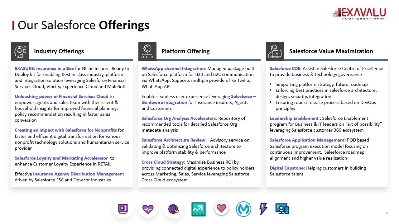 Exavalu as Salesforce Crest Partner, consistently goes above and beyond to guarantee the delivery of enhanced, expedited, intelligent, and tailored enterprise solutions. Here’s a snapshot of our offerings.